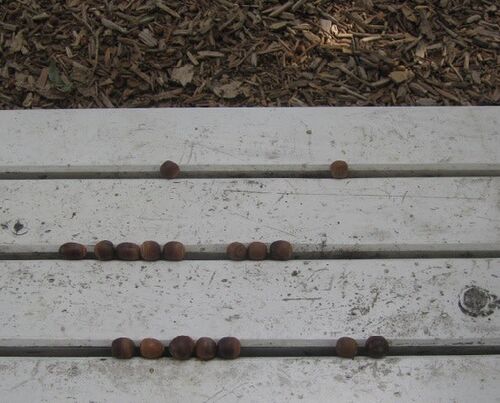 名城公園のベンチにも、日々変化するドラマがあります。 木立の中のベンチに、ドングリが並べられていた写真をいつか紹介しました。そして、今日はドングリの数が倍ほど並べられていました。誰が並べているのでしょうか? 別のベンチ、仲の良い野良猫2匹も…
